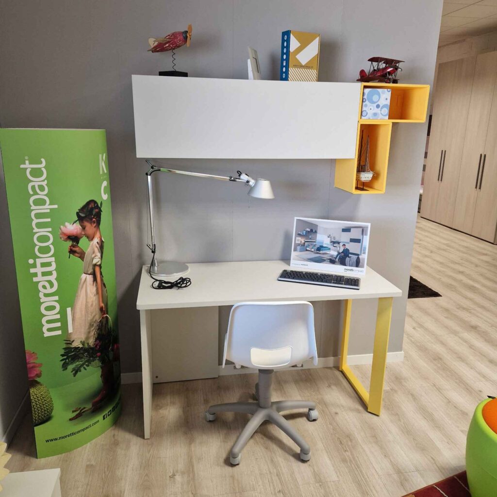 Scrittoio Moretti Compact completo di wallbox superiori color bianco e giallo Sole