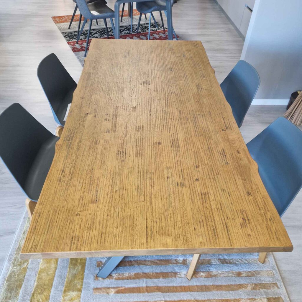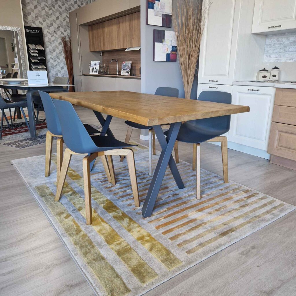 Tavolo predisposto per una o due prolunghe (optional) in legno massiccio con bordo scortecciato e finitura Groove e gambe in metallo finitura Antracite